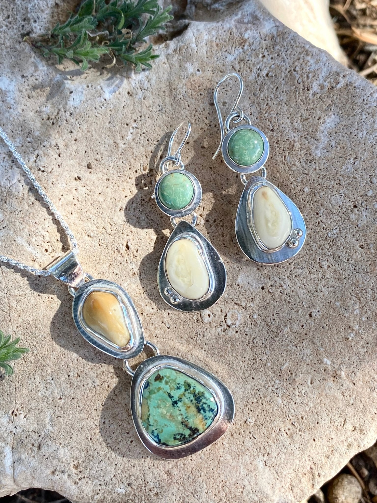 Elk Ivory and Turquoise Pendant A classic sterling silver pendant featuring a single elk ivory paired with a high-quality turquoise stone. Clean lines and balanced...