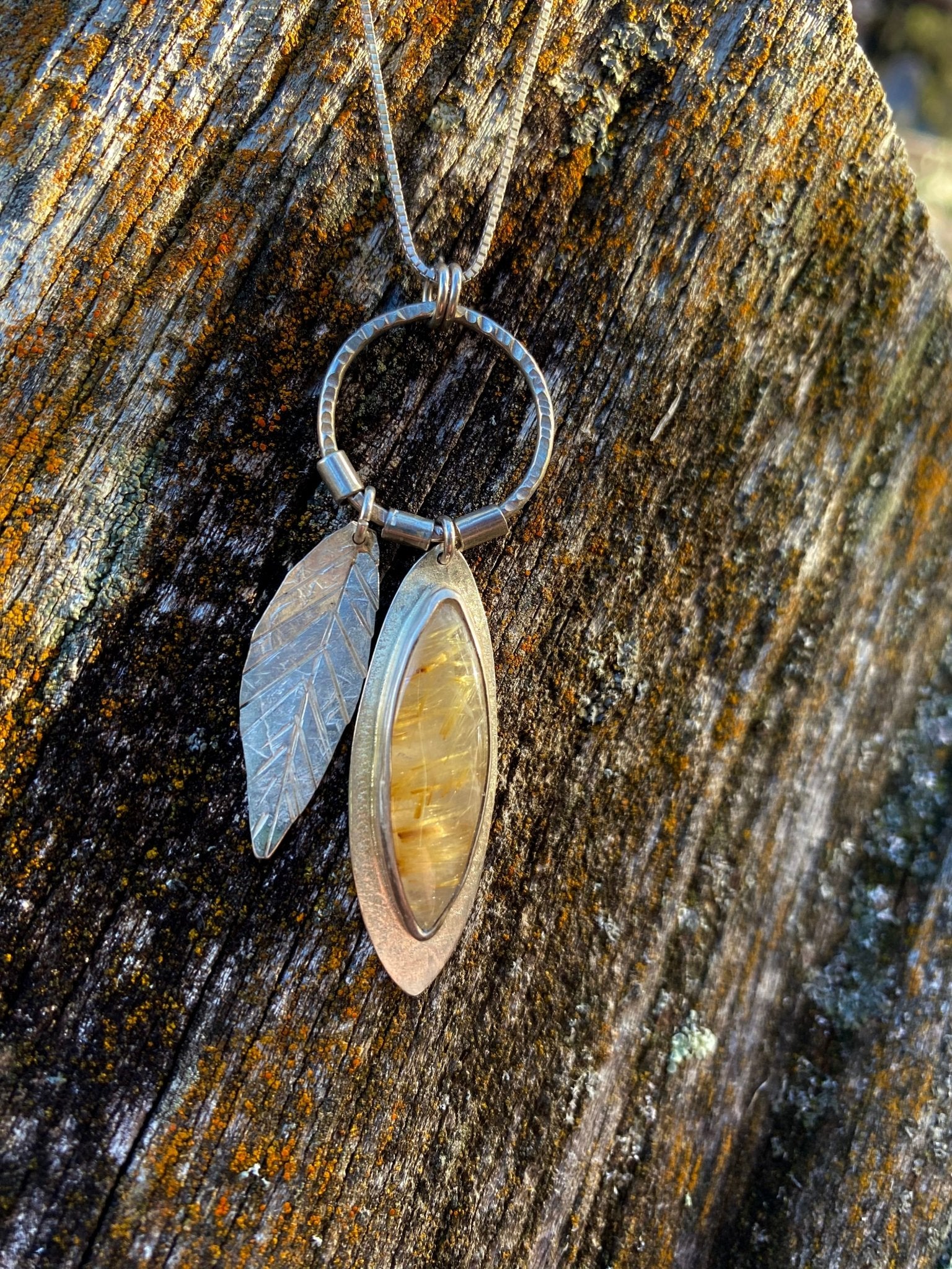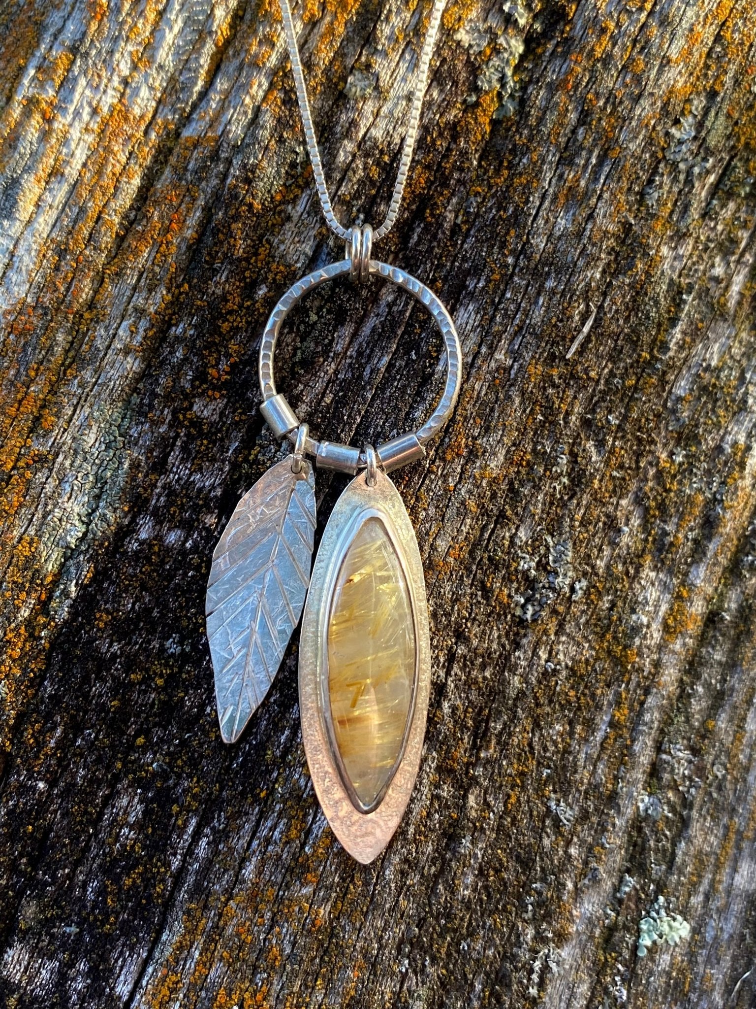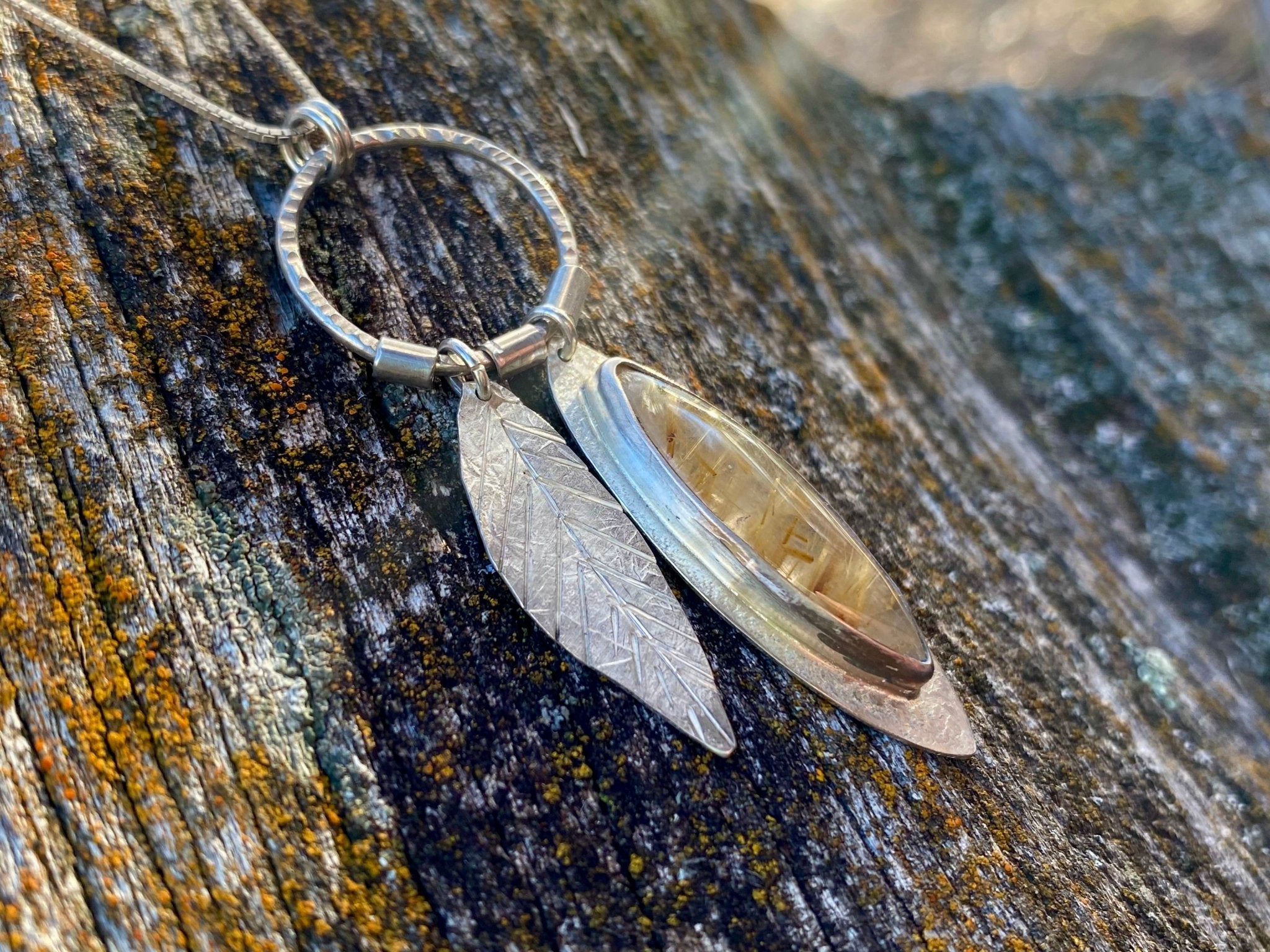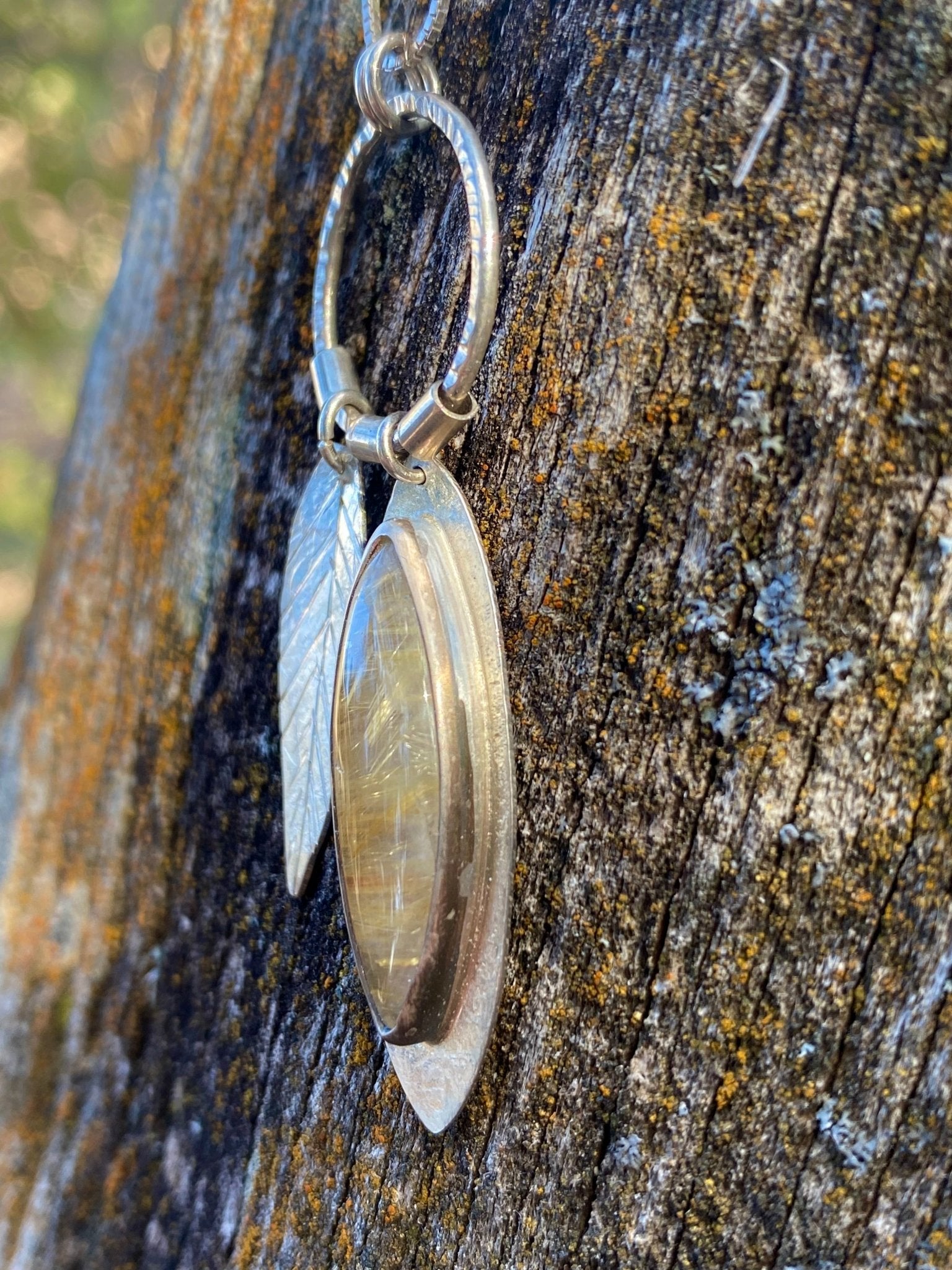 Stunning clear Quartz with golden Rutile inclusions set in a sterling pendant with a hand crafted sterling leaf. A fun kinetic piece! 22” adjustable sterling...