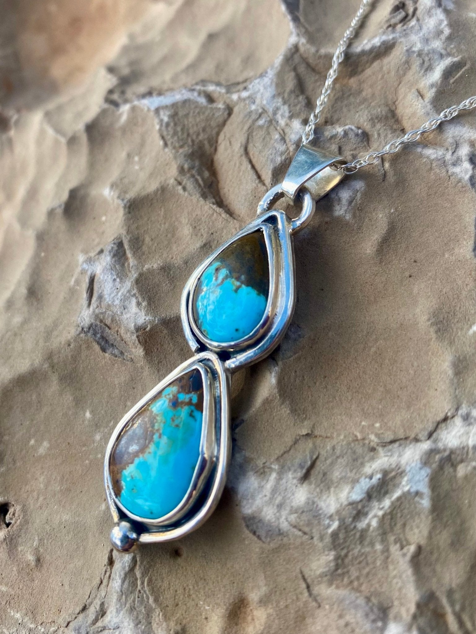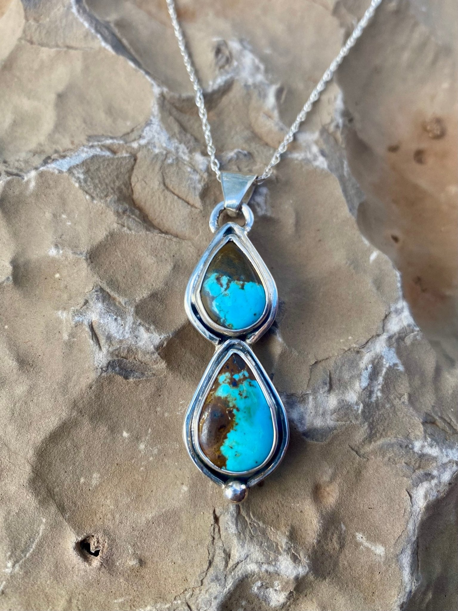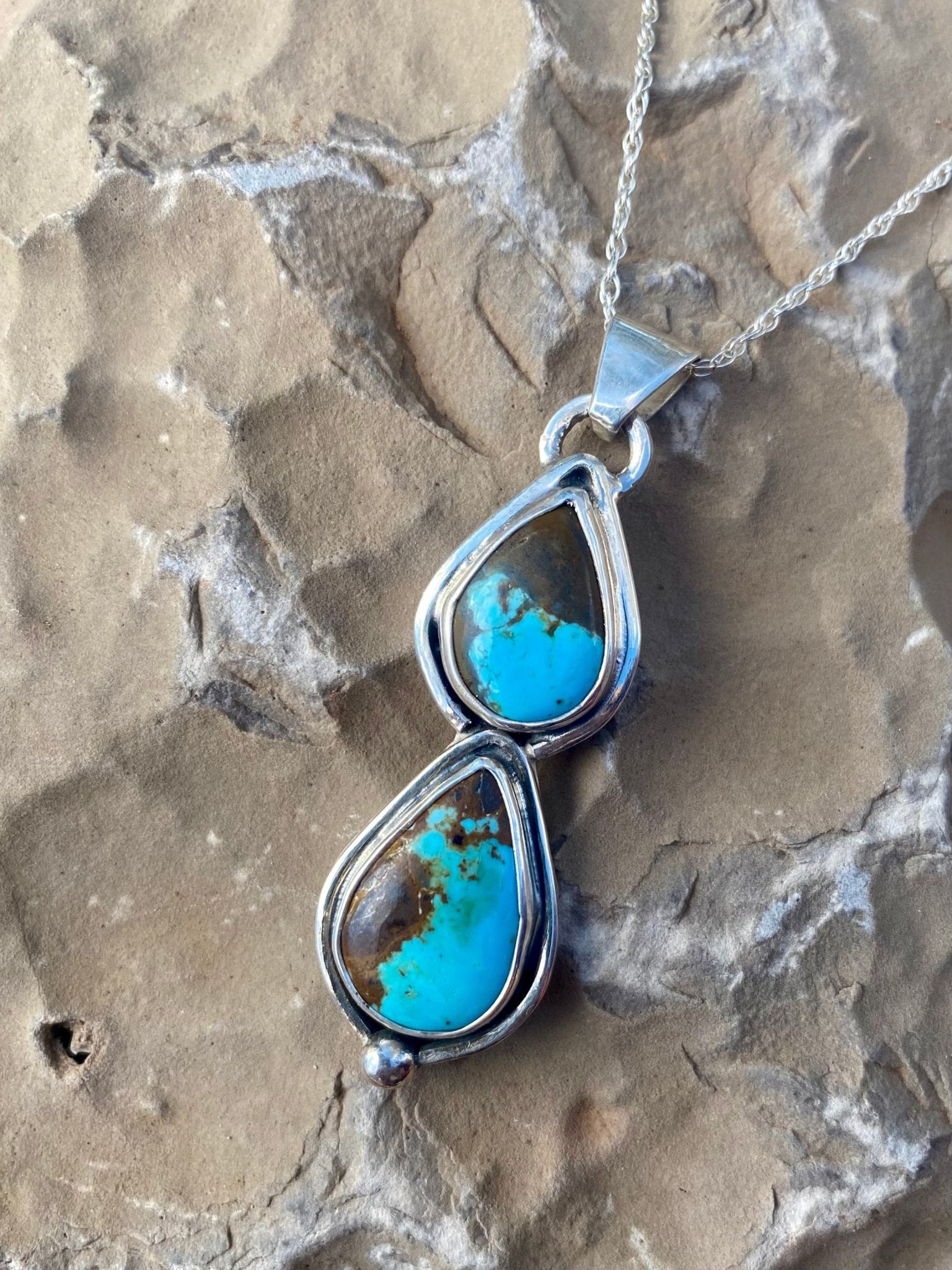 This handcrafted pendant features two genuine Number 8 Turquoise stones from Nevada, stacked in a graceful vertical design. Known for its vivid blue color...