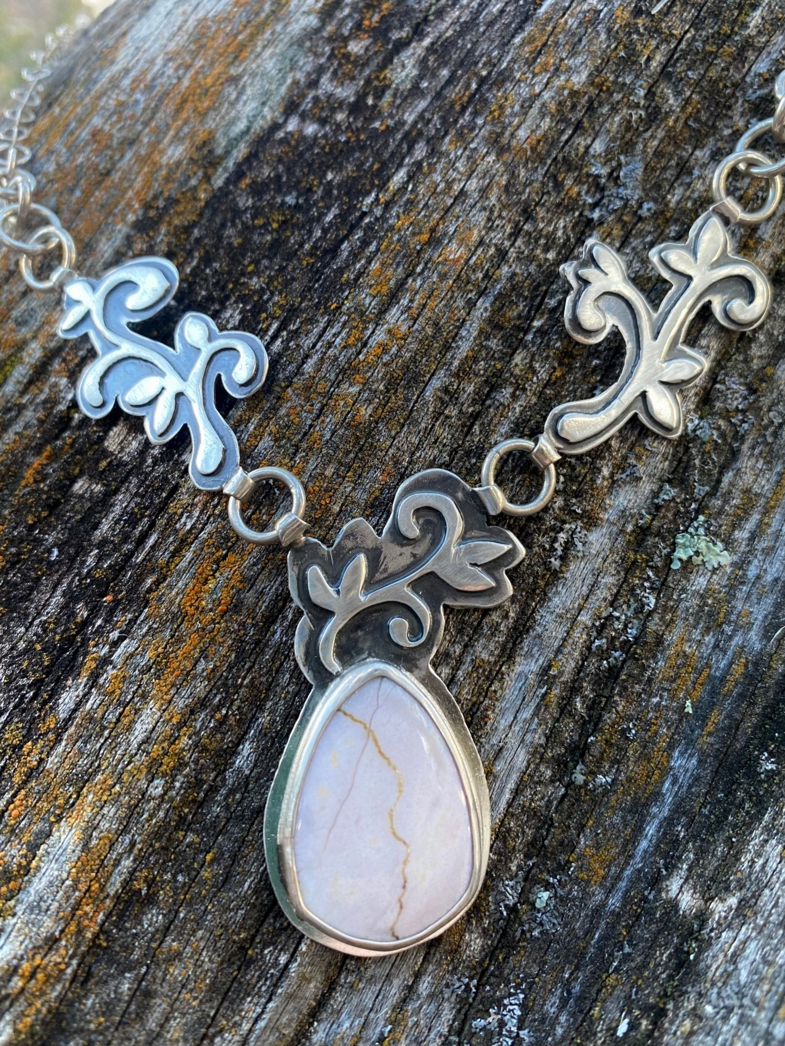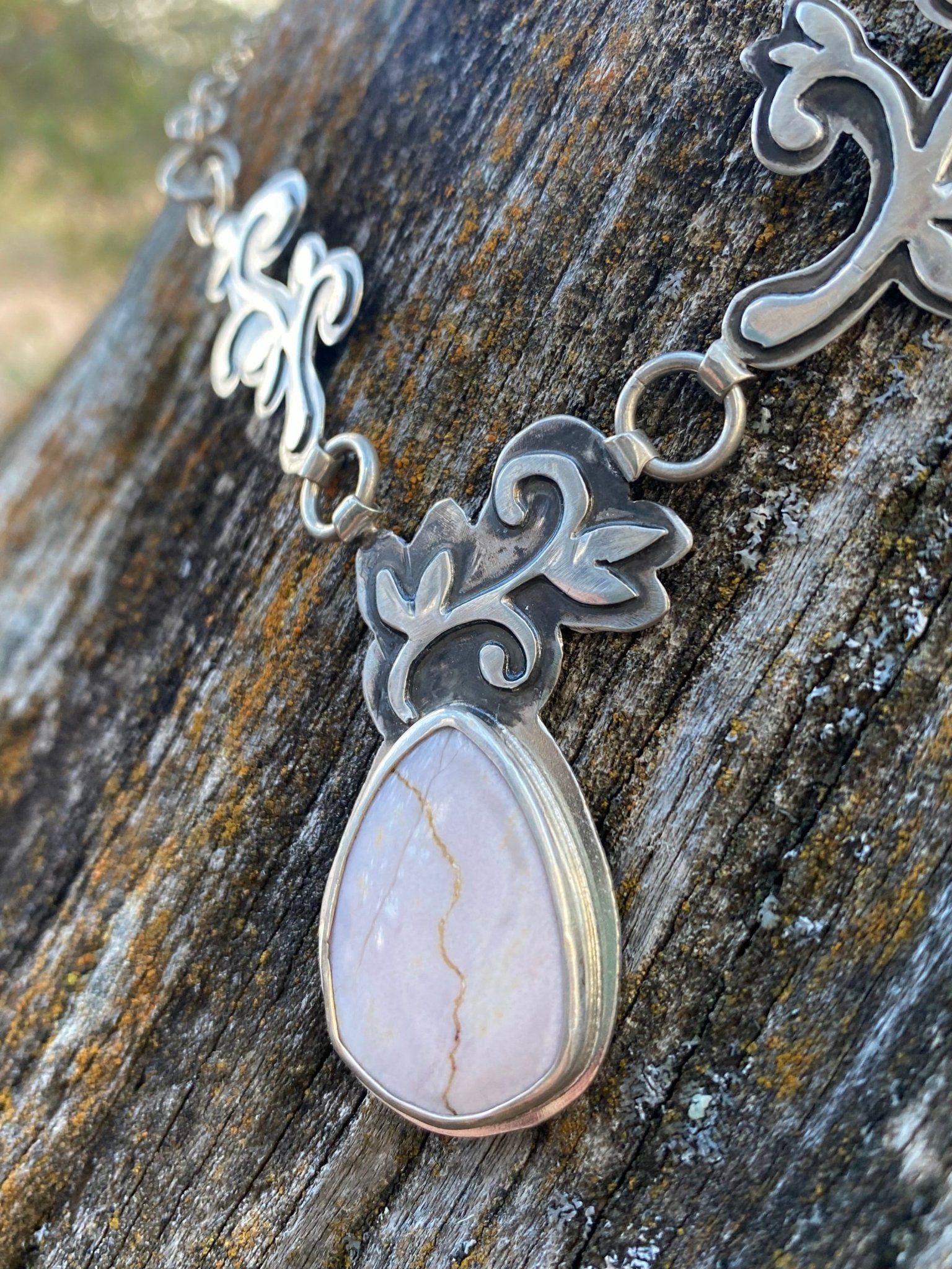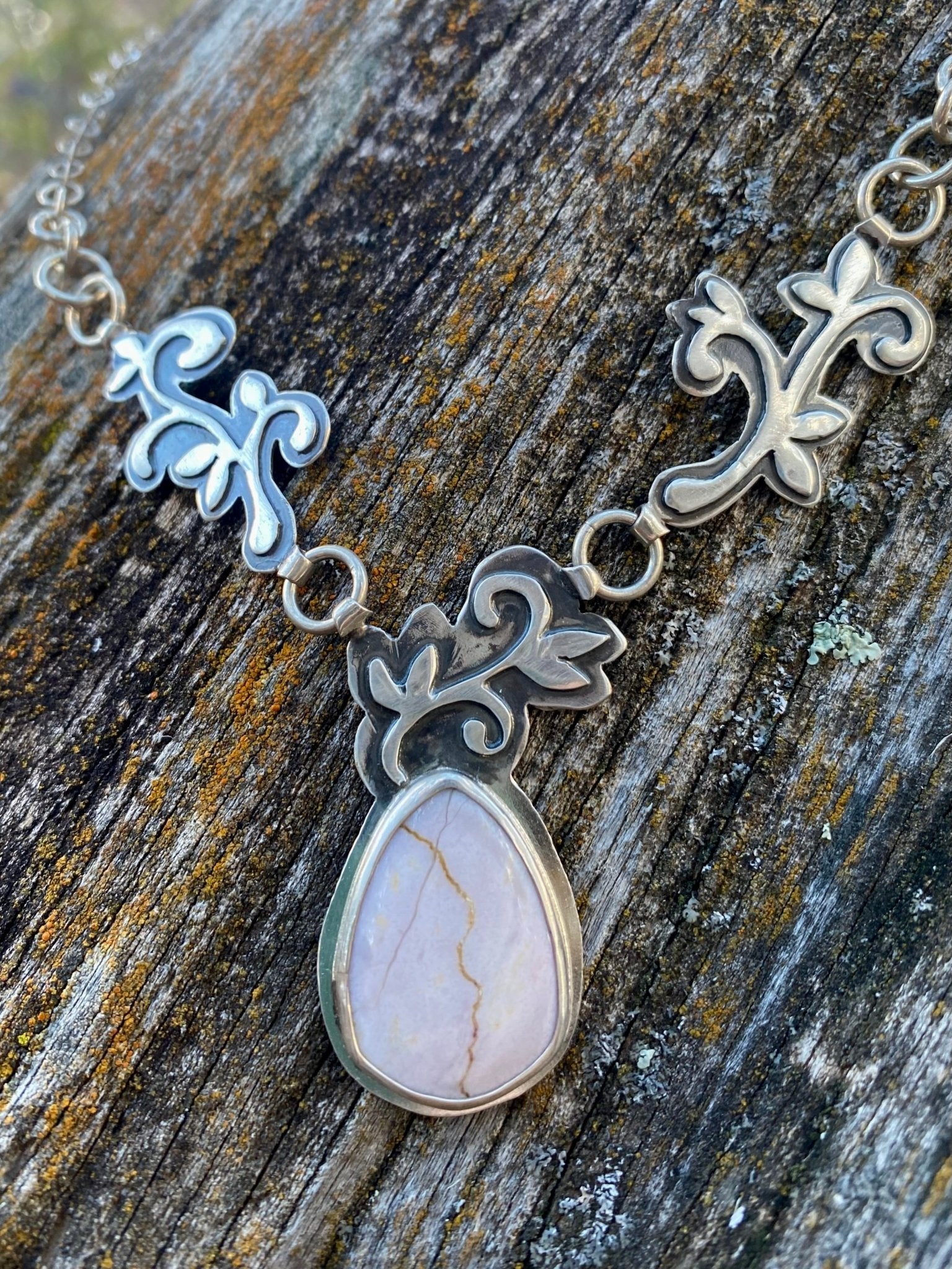 This one-of-a-kind necklace features a soft blush Oregon Sunset Jasper, marked with a natural golden vein that runs through the stone like a desert horizon...