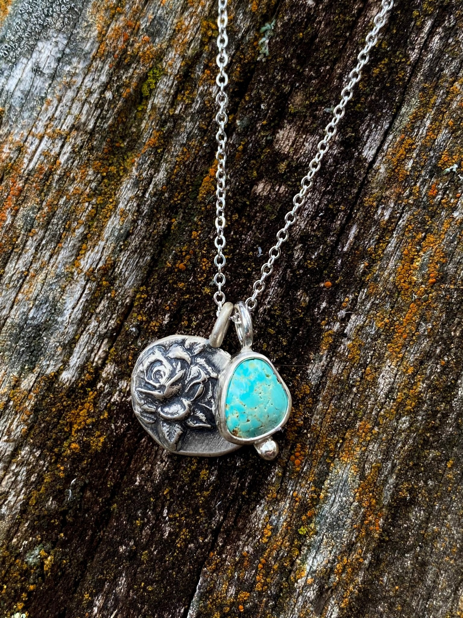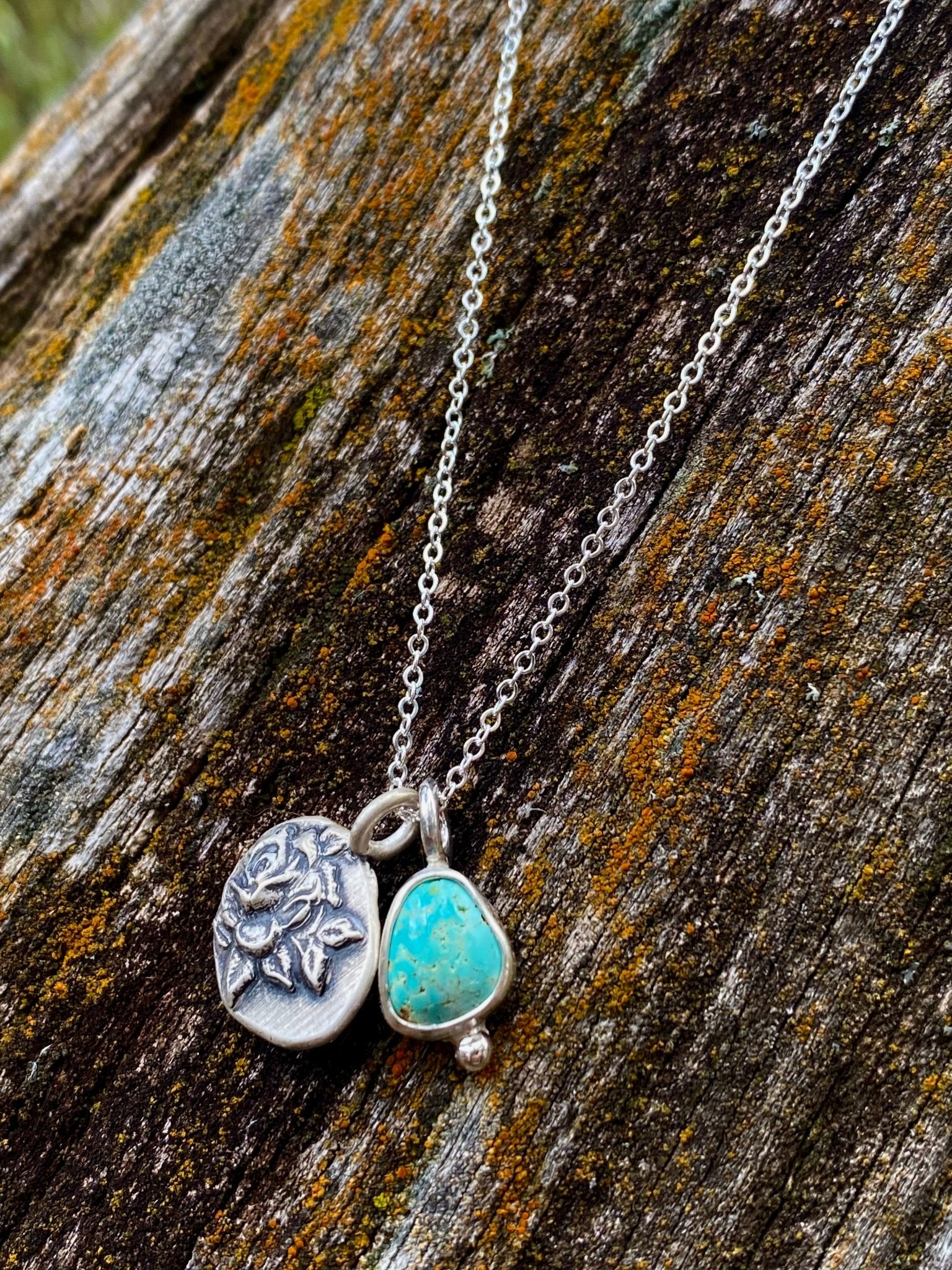 A delicate pairing of hand-set turquoise and a small sterling rose medallion creates this layered charm necklace. Designed for everyday wear, each piece combines soft...