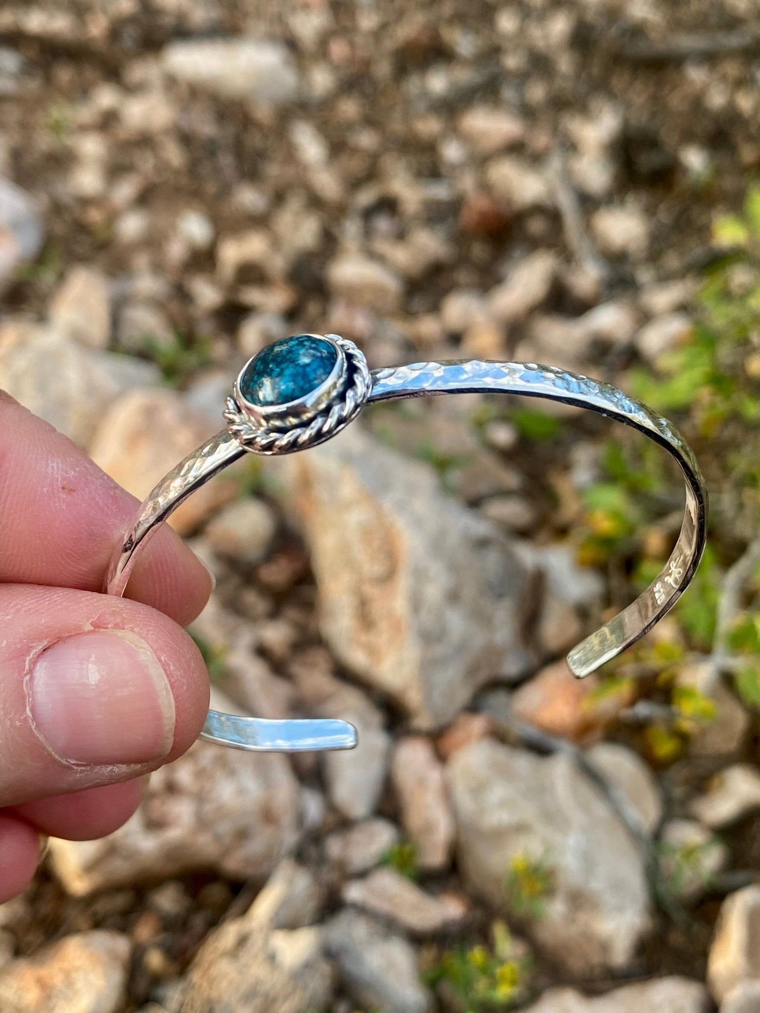 Like a fragment of the desert sky, this sterling silver cuff features a rich dark blue turquoise with intricate webbing. The hammered band catches the...