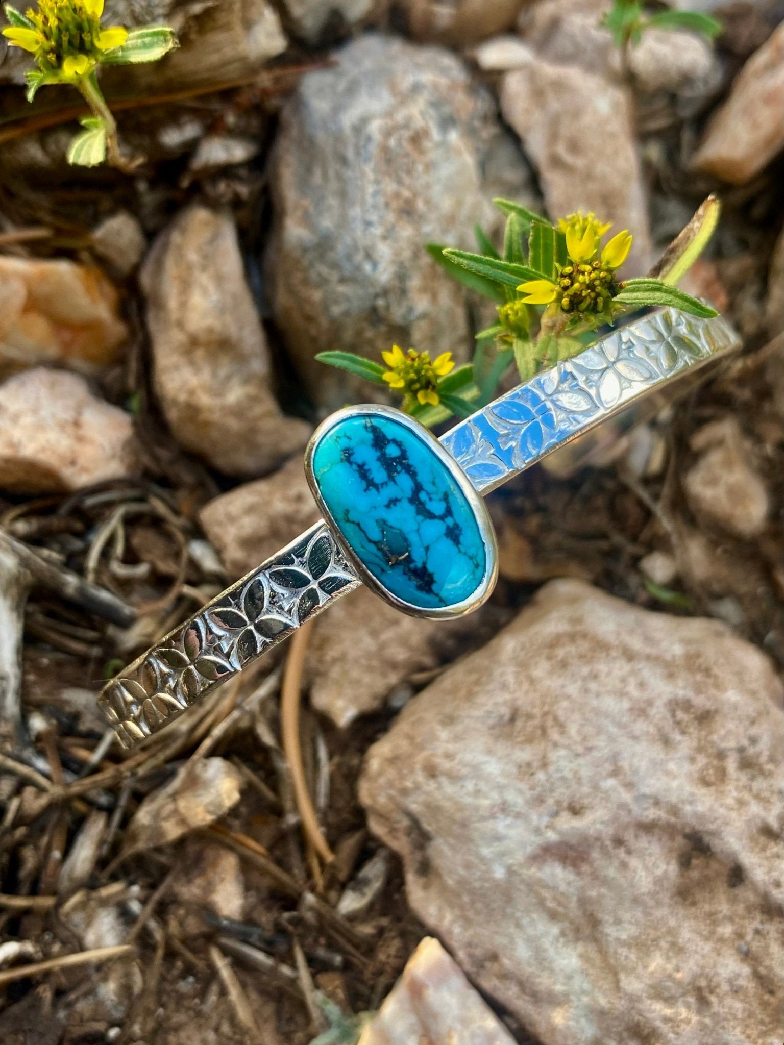 A blooming tribute to the high desert, this cuff blends graceful silverwork with the wild charm of natural turquoise. this cuff features a Kingman Turquoise...