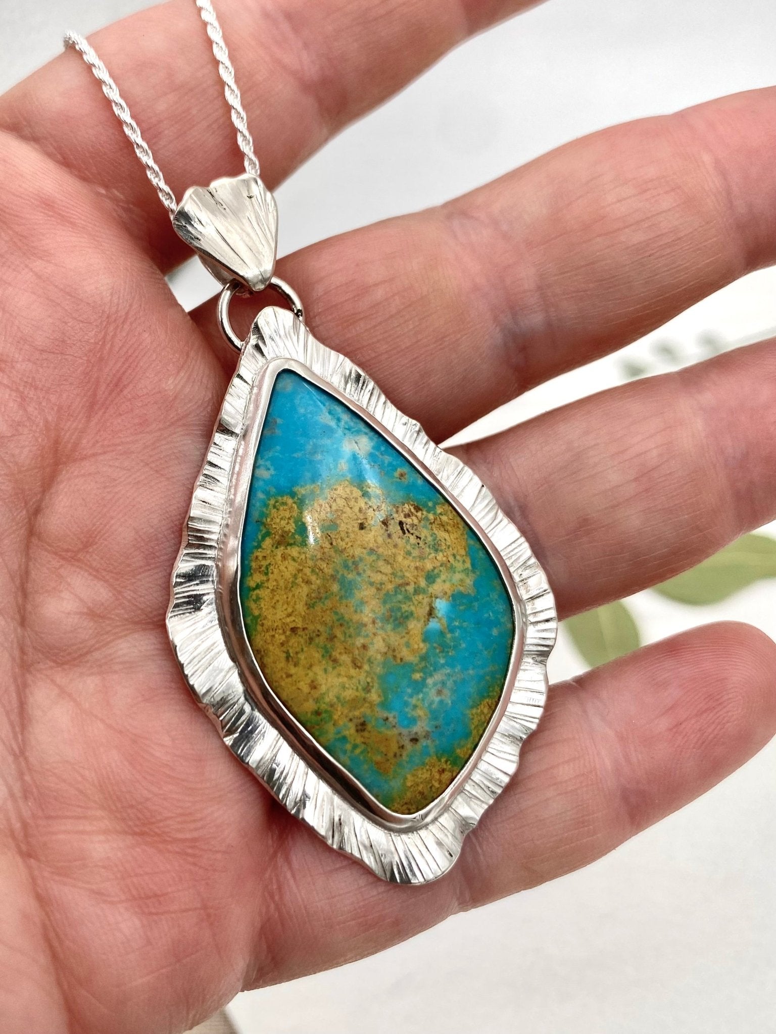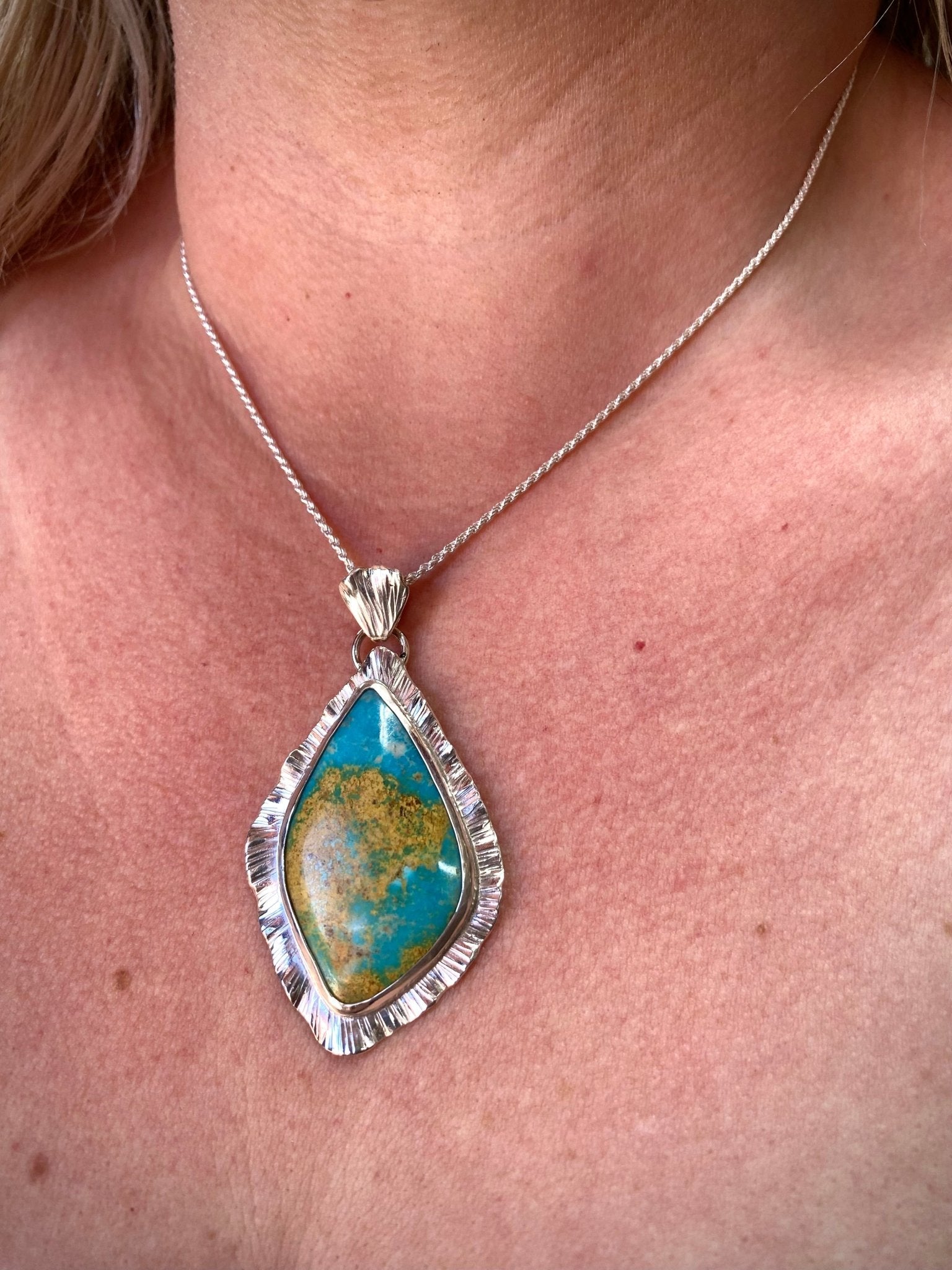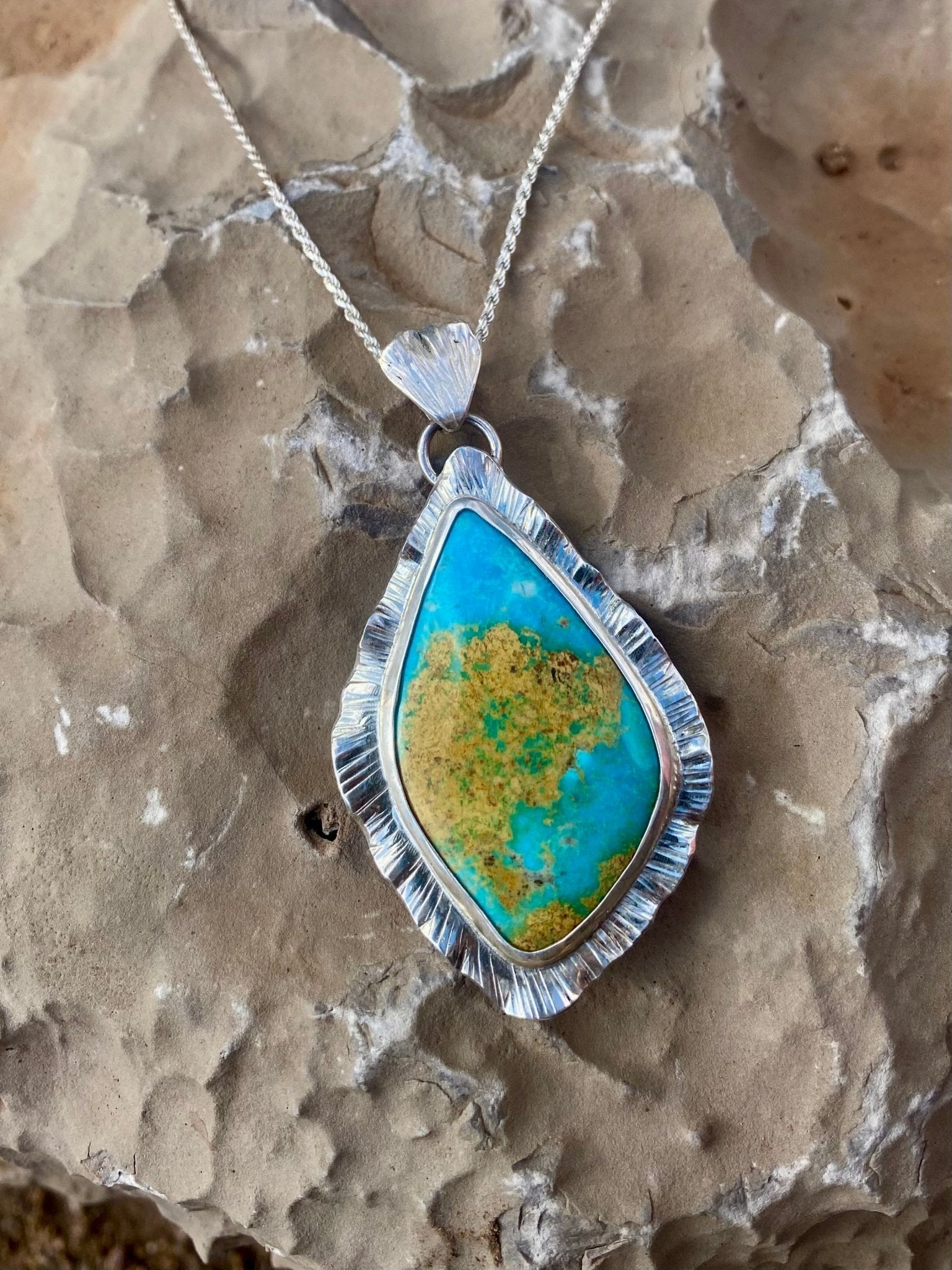 A softly sculptural pendant inspired by open skies and desert light. This boho style necklace features a natural Royston turquoise stone set in sterling silver,...