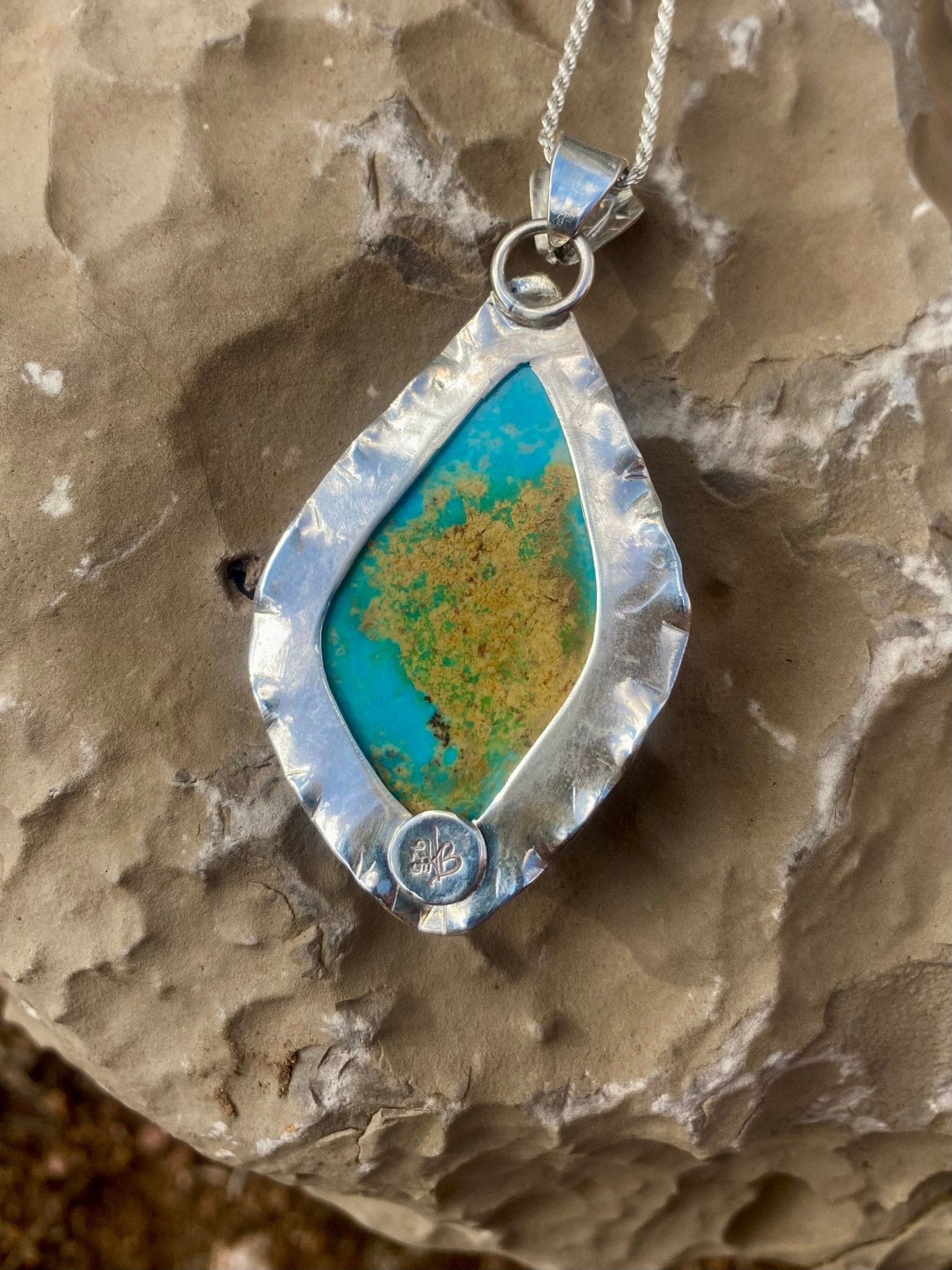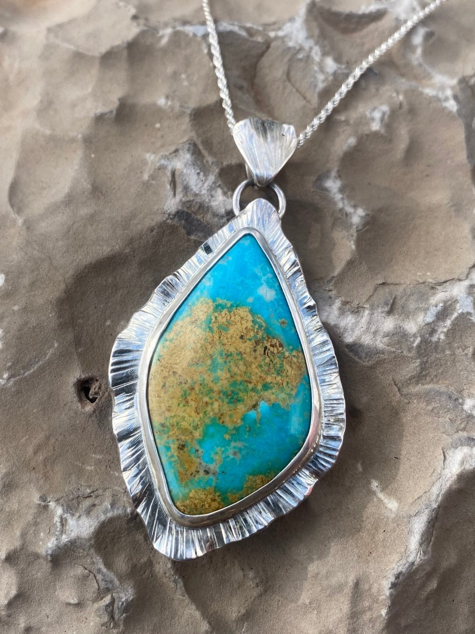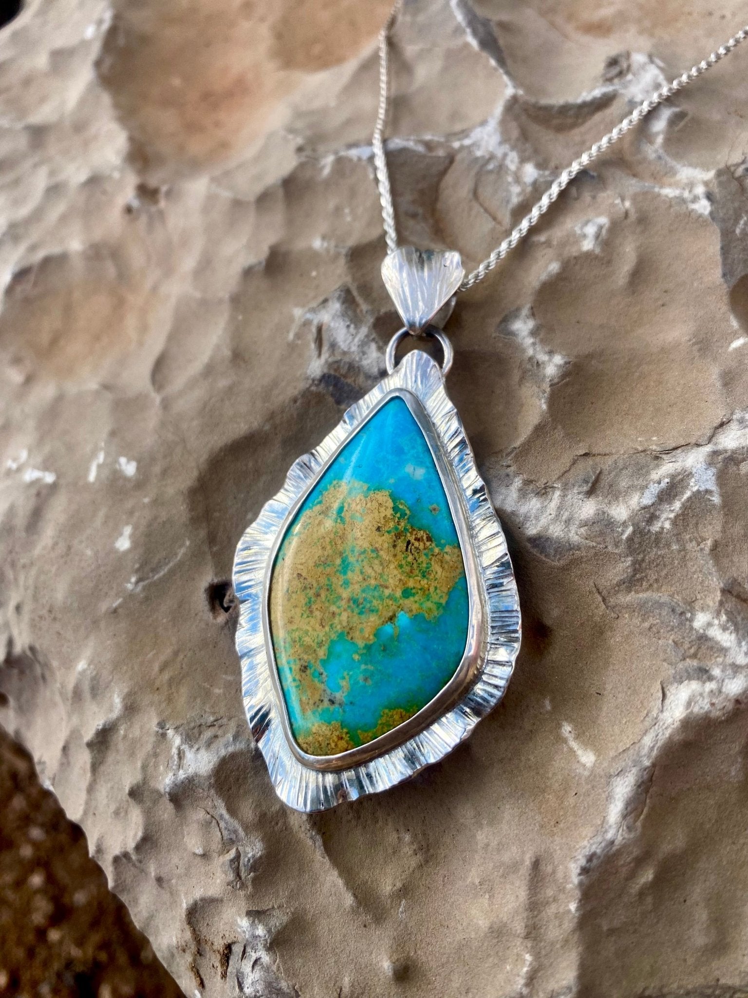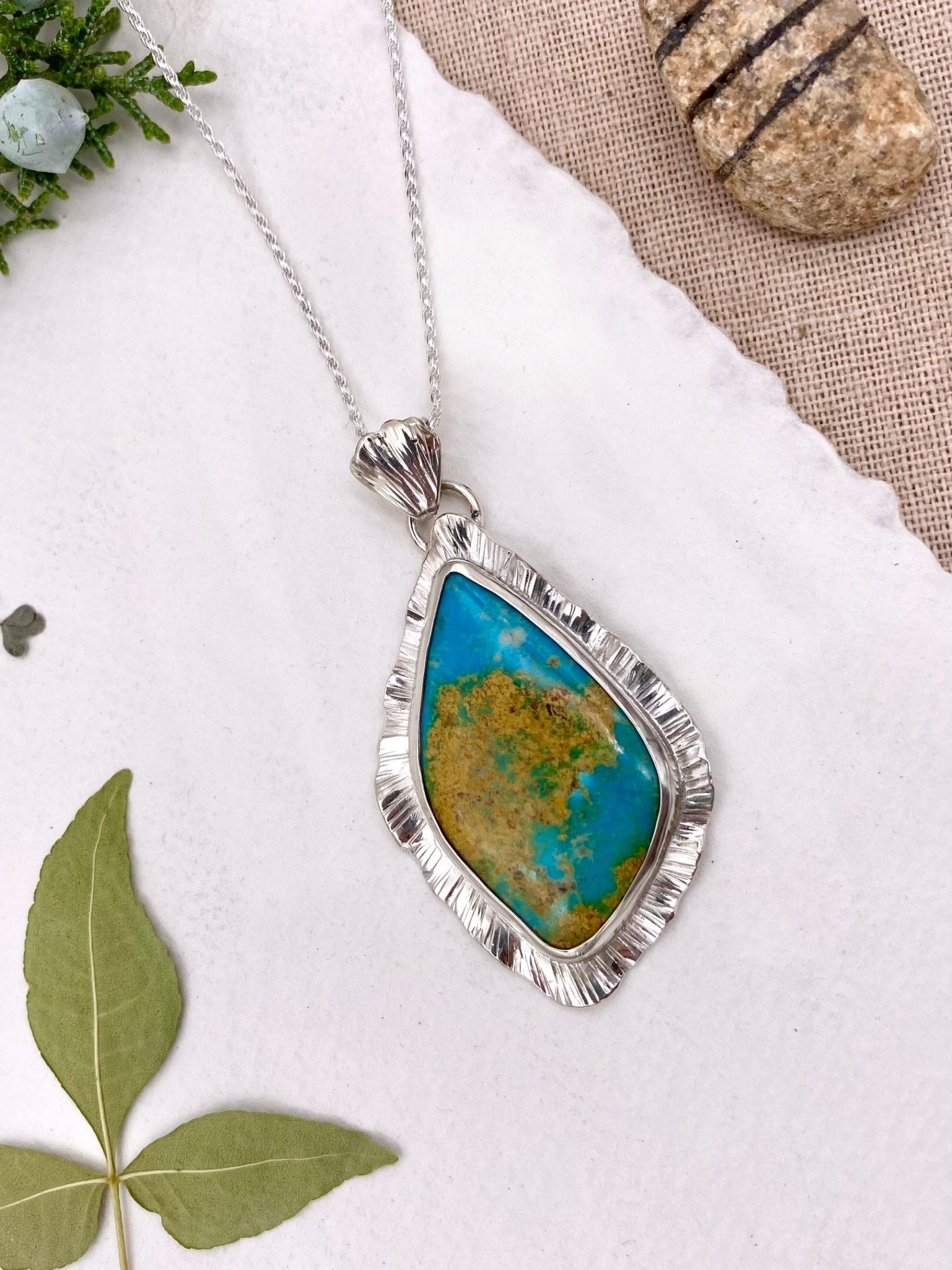 A softly sculptural pendant inspired by open skies and desert light. This boho style necklace features a natural Royston turquoise stone set in sterling silver,...