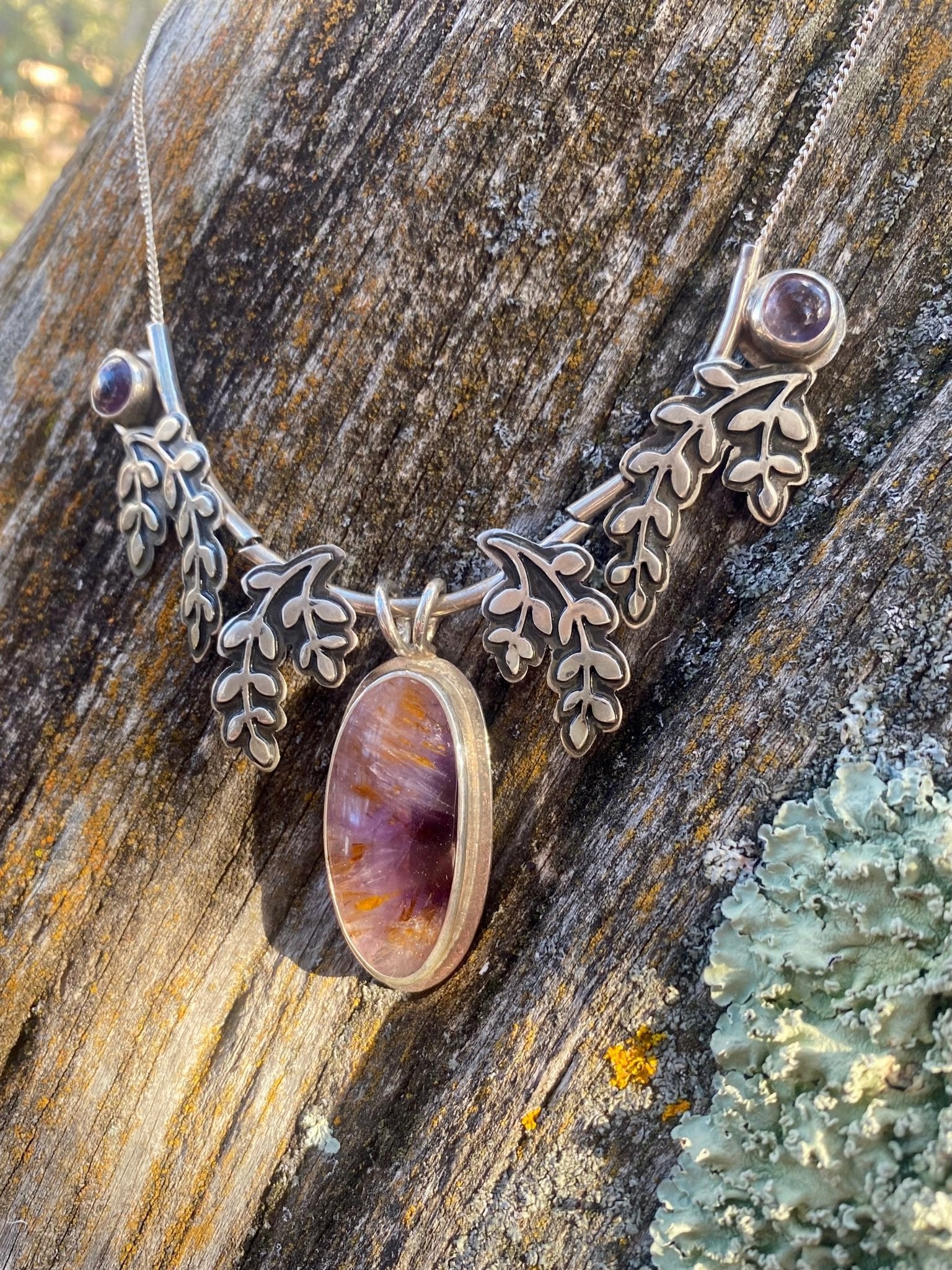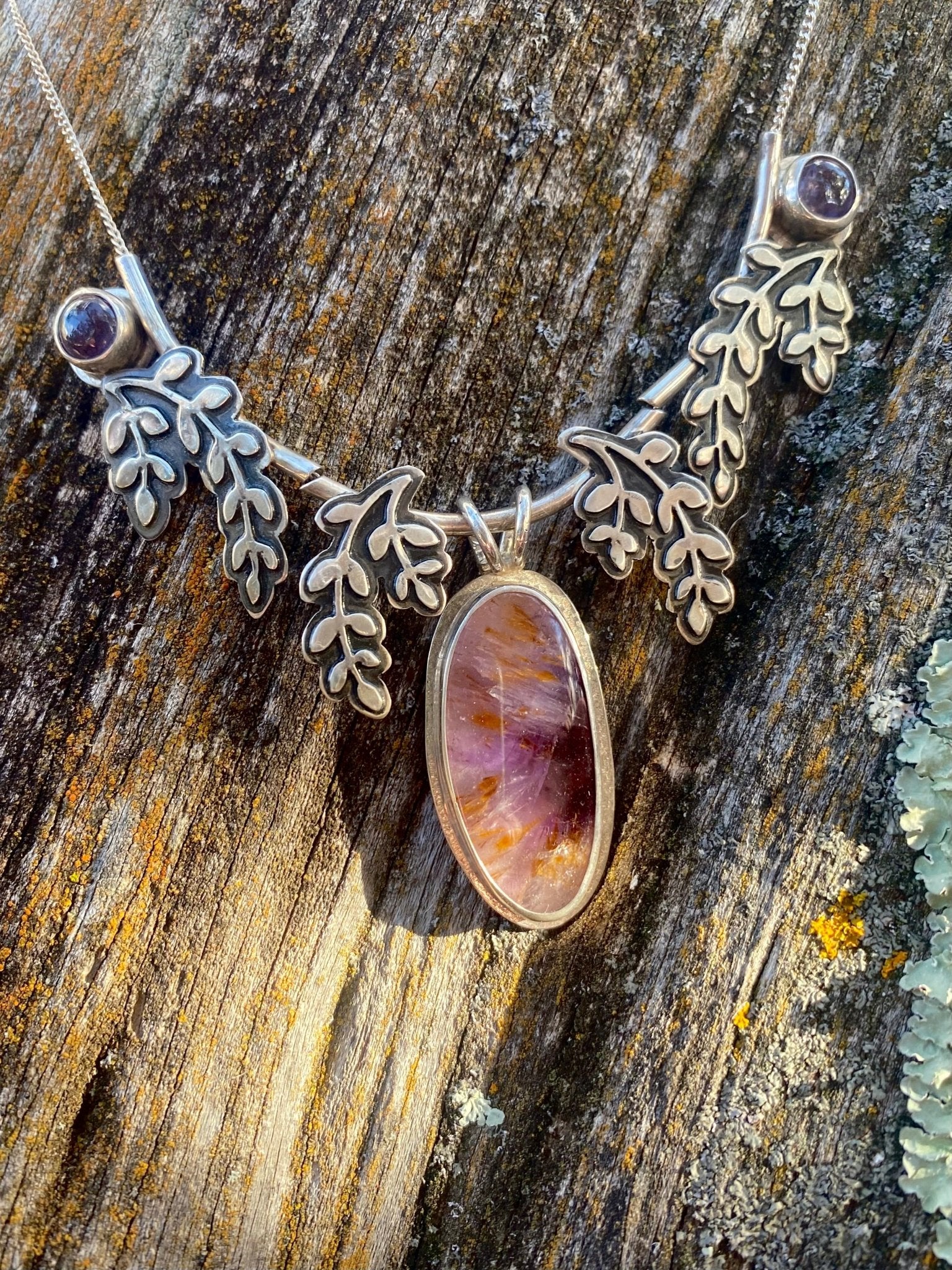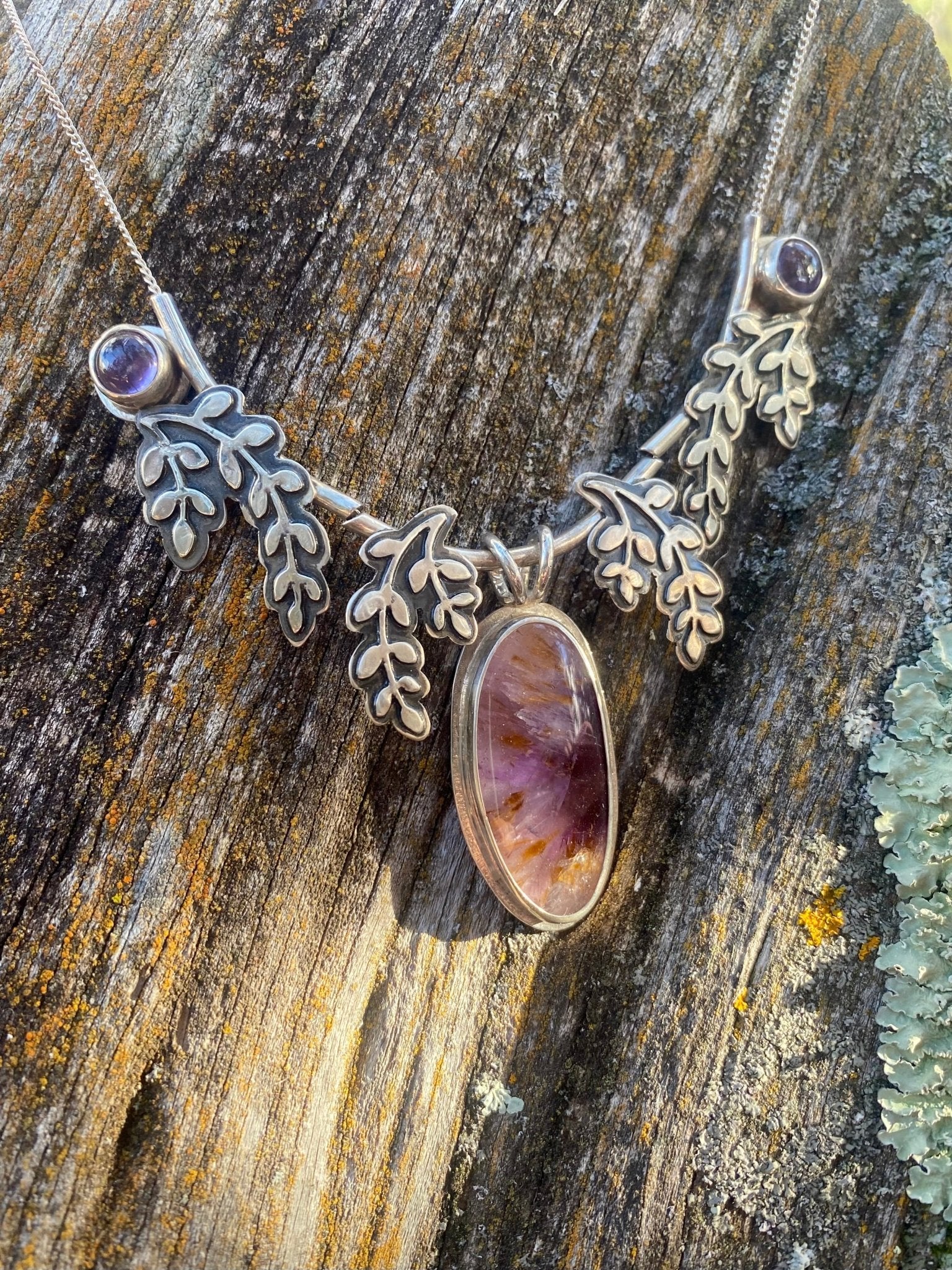 A luminous Super Seven gemstone takes center stage in this nature-inspired design, its purple depths and warm golden inclusions creating remarkable dimension and movement within...