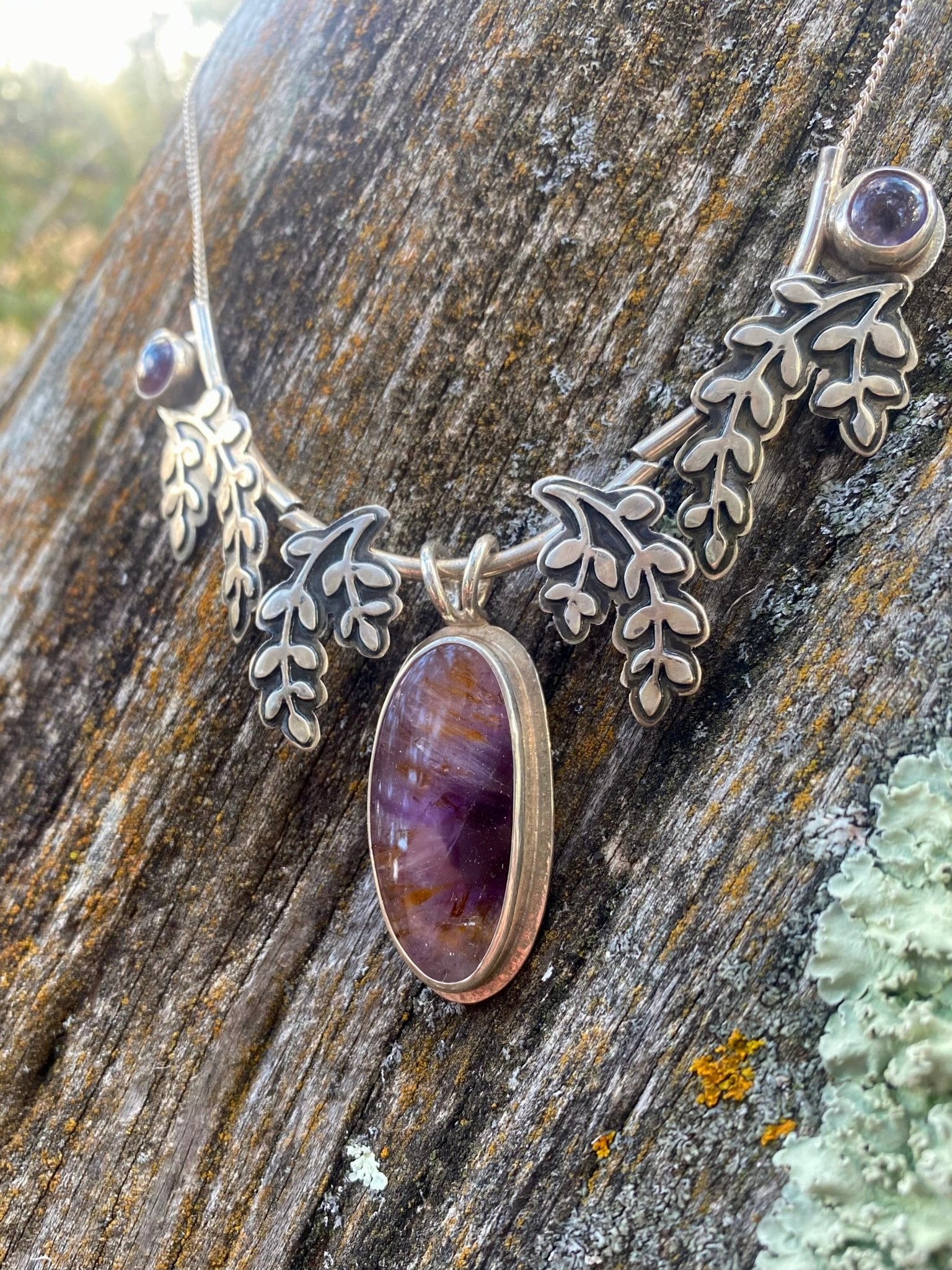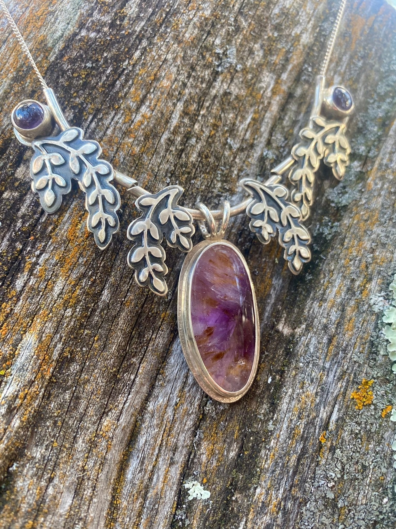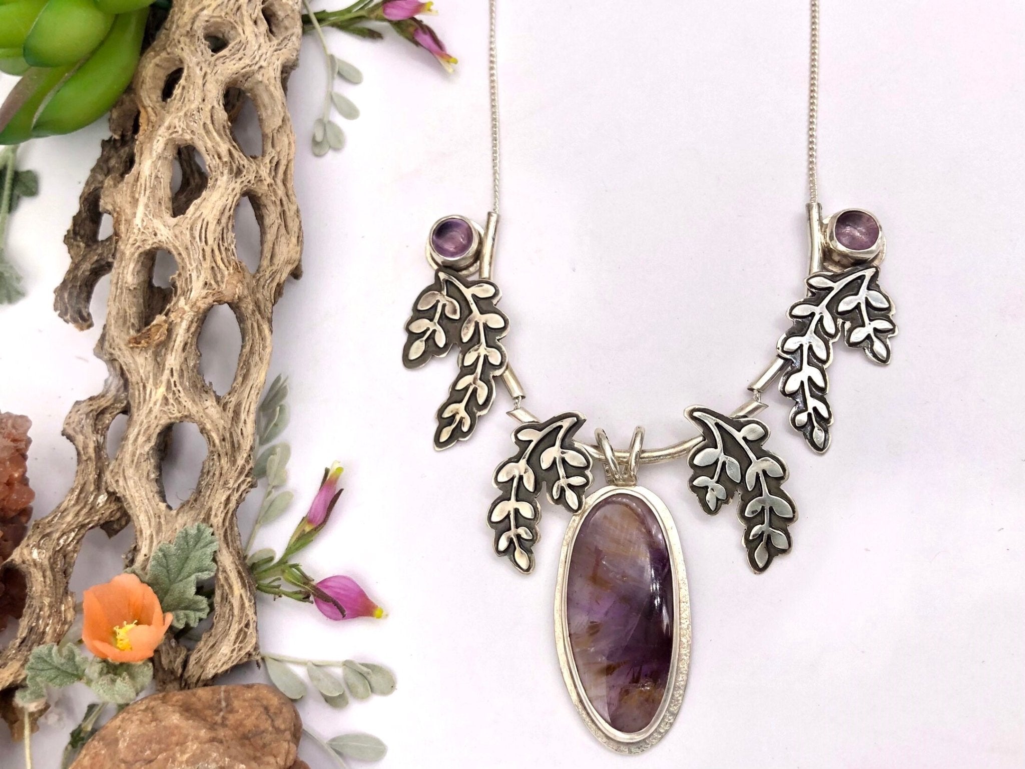 A luminous Super Seven gemstone takes center stage in this nature-inspired design, its purple depths and warm golden inclusions creating remarkable dimension and movement within...