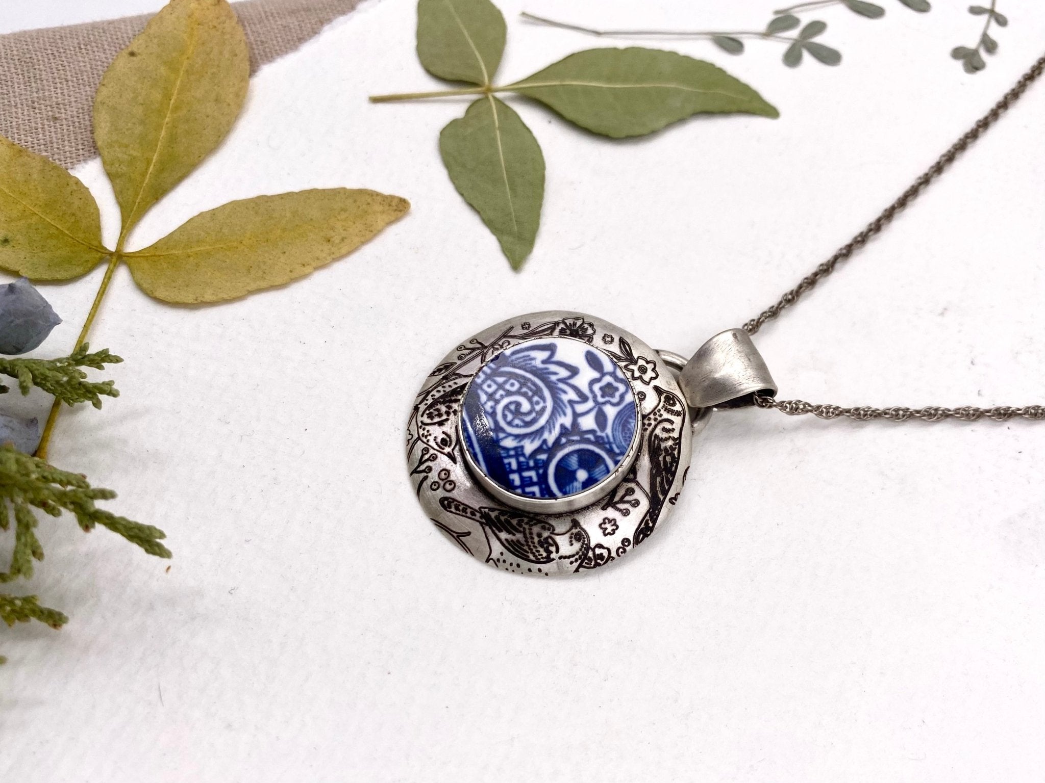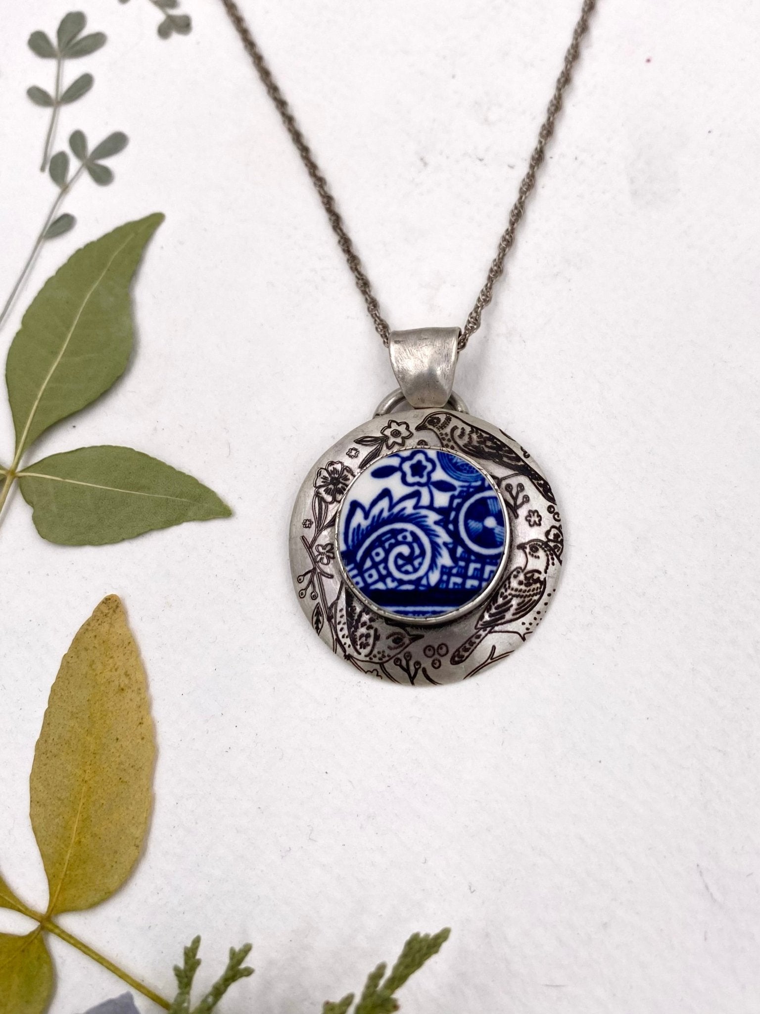 Bold cobalt blue and white porcelain inspired this fun engravedpendant. Dark patina complements the vibrant color. Engraved birds and leaf design add fun detail on...
