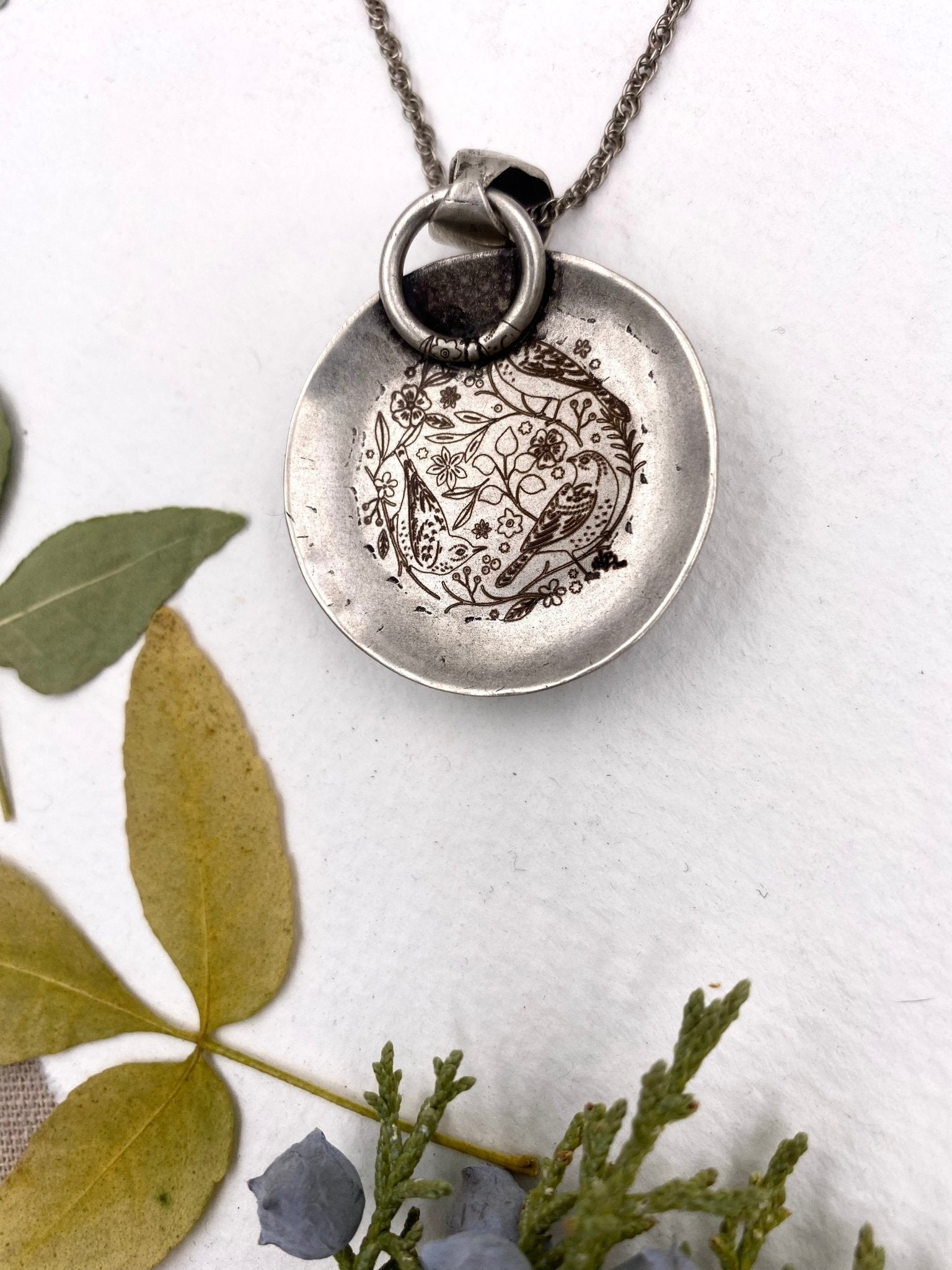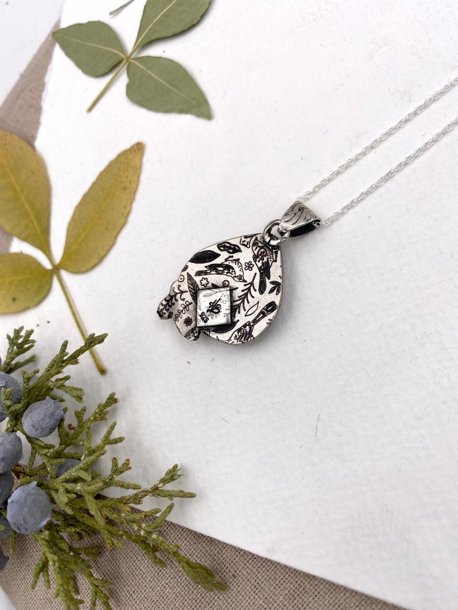 A quiet ode to nature and nostalgia, this pendant feels plucked from a forgotten storybook. Layered sterling silver is etched with wildflowers, their darkened petals...
