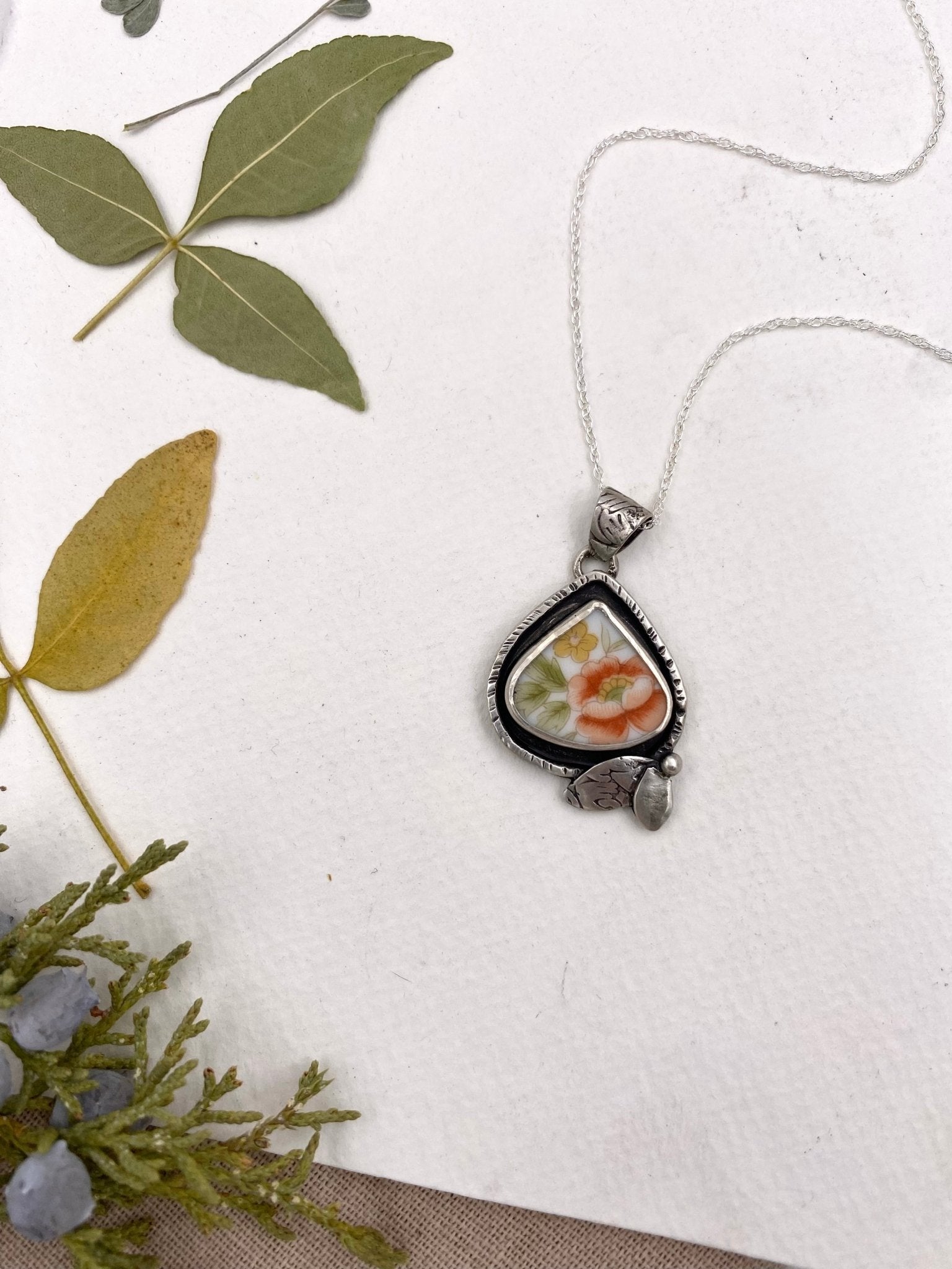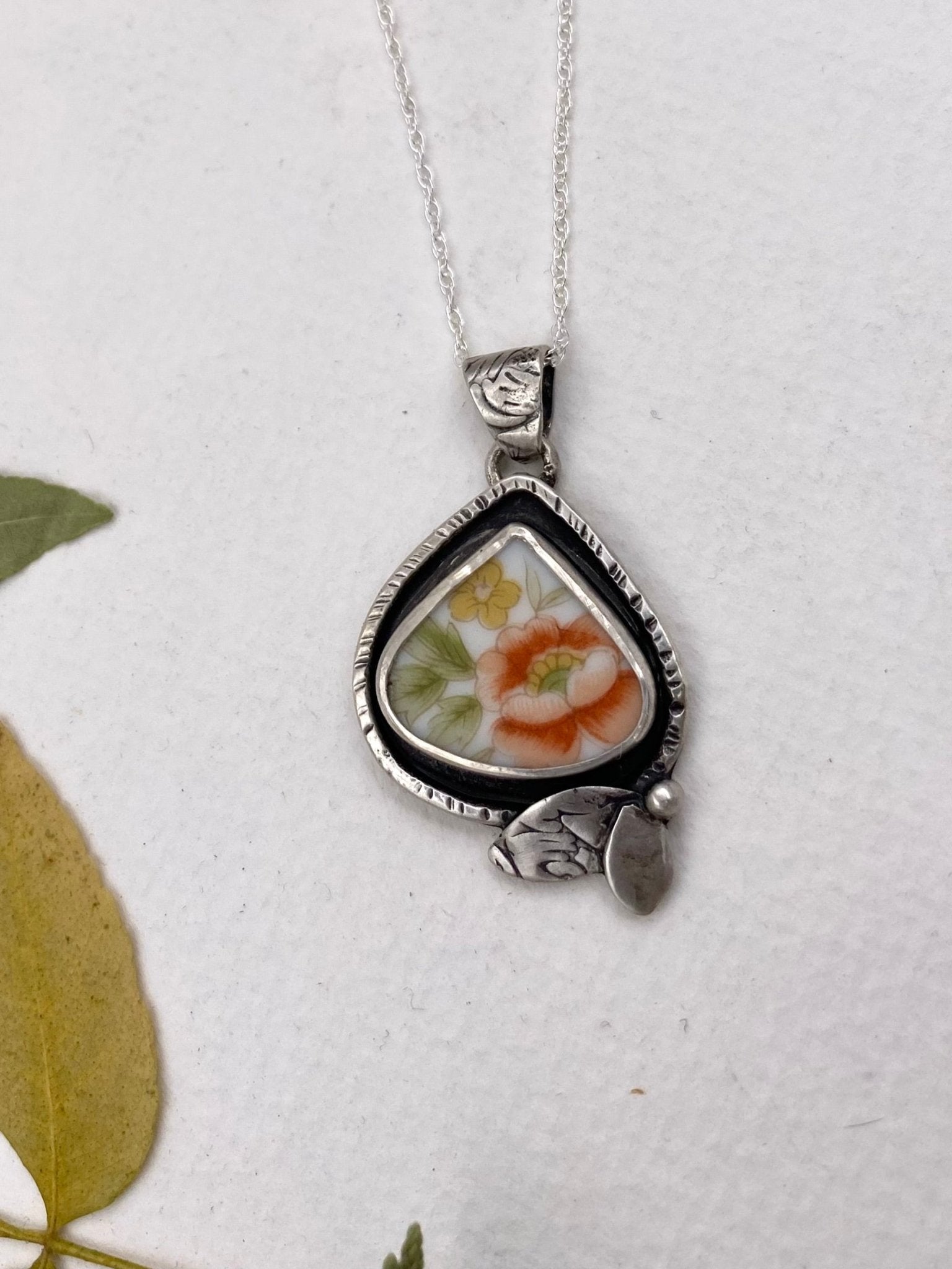 Lovely orange, yellow and cream porcelain inspired this shadow box style pendant. Dark patina complements the vintage colors. Engraved birds and leaf design add fun...